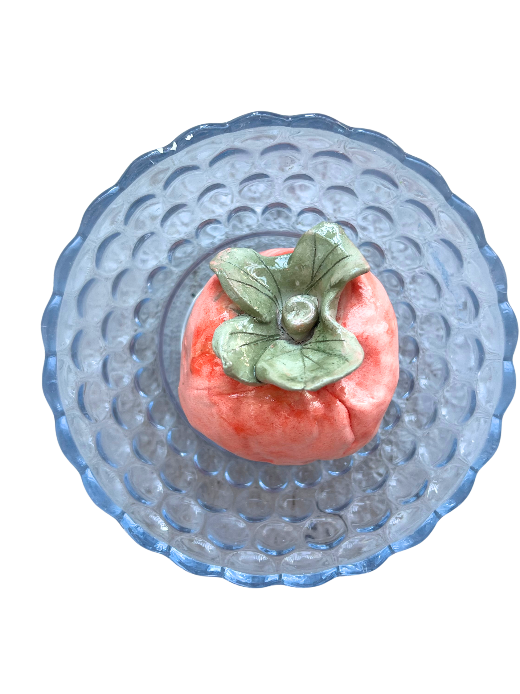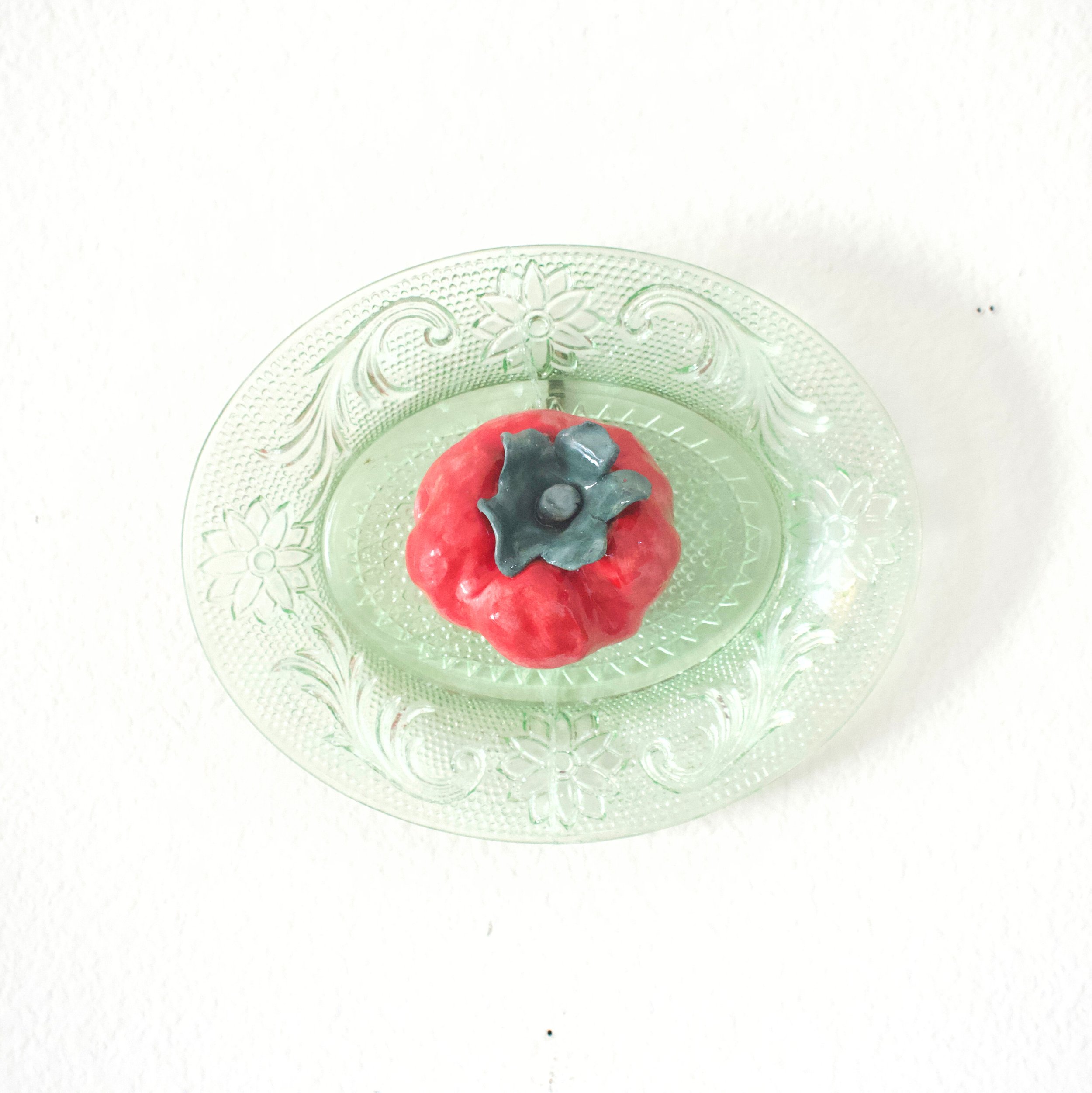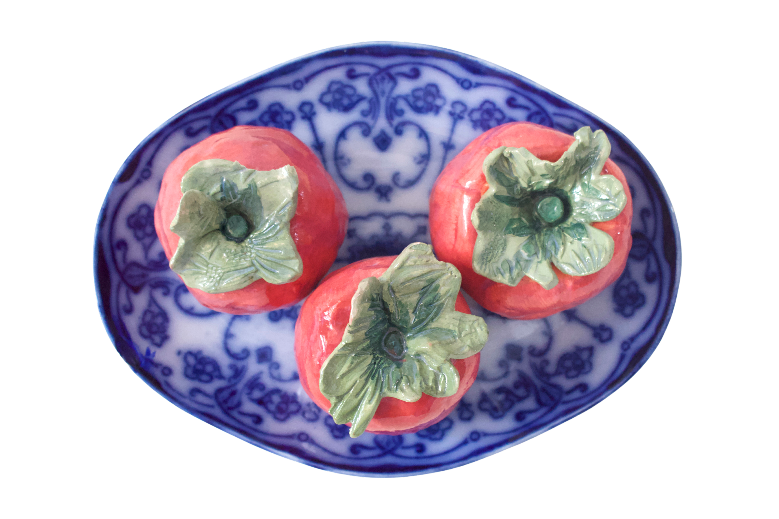 Cemented in time through hand-built ceramic and found porcelain, each work expresses a unique personality of its own. The rhythm of producing and matching each individual tomato to each plate felt akin to organizing, collecting, and curating my own thoughts and memories. Throughout this process, I pondered my reasons and motivations for continuing with this imagery, and ultimately found that there are deep pools of gratitude and meaning when sitting with influential experiences that take time to wade through. With continuous encouragement and insight from friends and family, I decided to name each piece after influential women in my life.